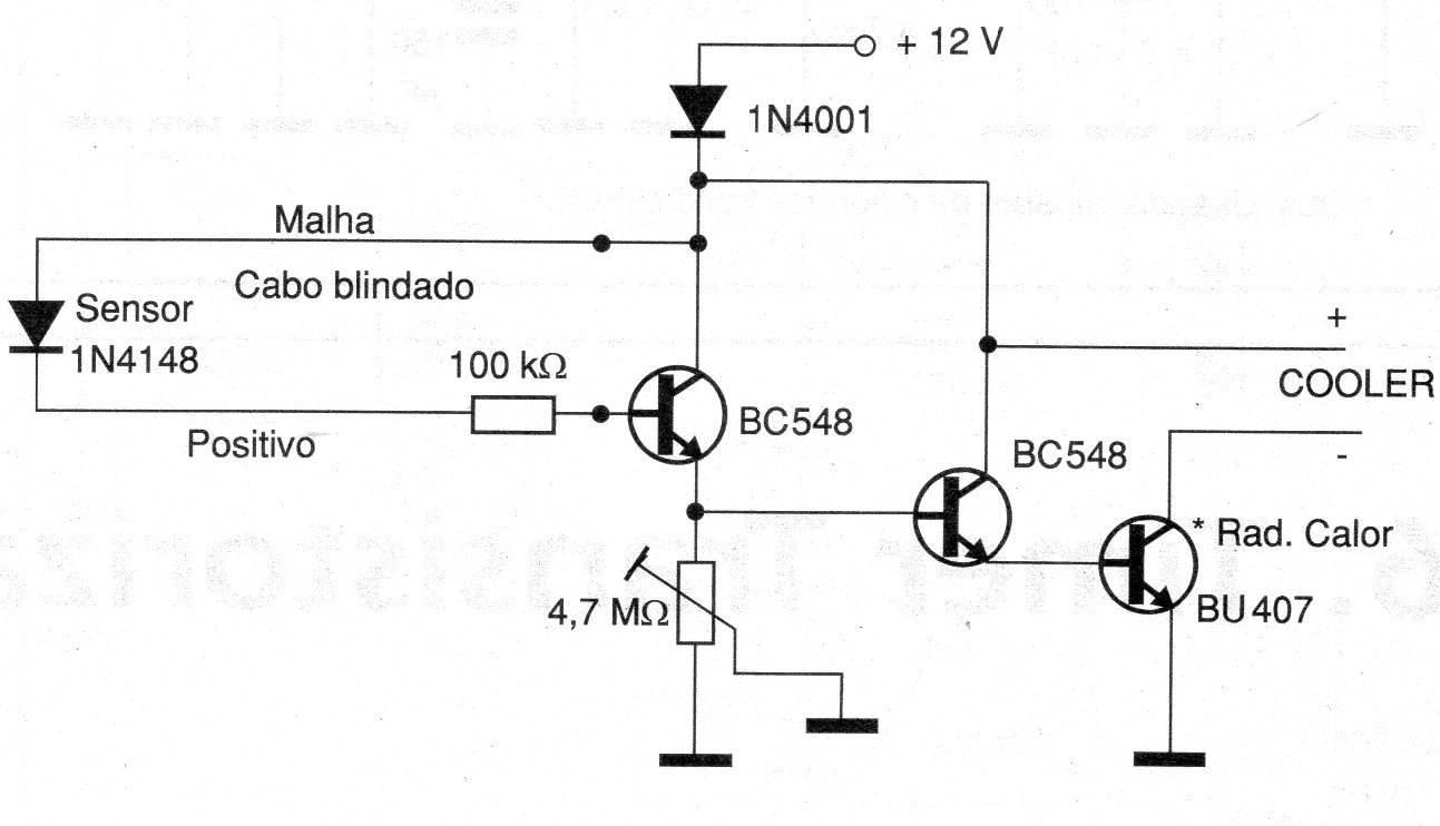 El sensor de este circuito es un diodo de silicio común y acciona directamente un pequeño enfriador con una corriente de hasta 2 o 3 A. El transistor de potencia debe montarse en un disipador de calor y la alimentación de 12 V. El ajuste del punto de operación se realiza en el trimpot.
