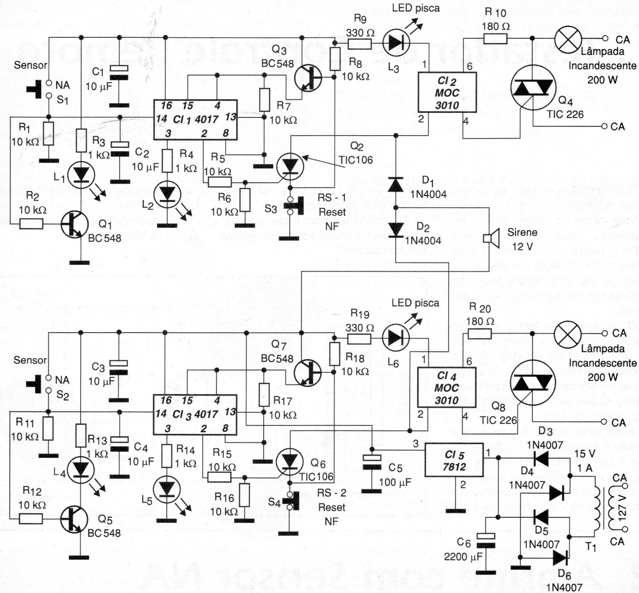 Este circuito se encontró en la documentación de 2003, pero todos los componentes utilizados siguen vigentes. La alarma tiene varias características y utiliza un acoplador óptico para controlar las lámparas incandescentes a través de triacs. Los triacs deben estar equipados con disipadores de calor y la alimentación debe ser suministrada por la fuente incluida en el diagrama.
