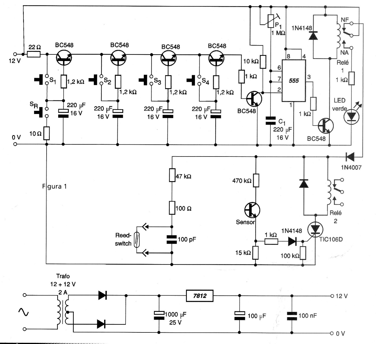 La desactivación de este circuito de una documentación de 2002 solo se puede hacer presionando 4 teclas en una secuencia correcta. El circuito puede ser alimentado por 12 V de batería o fuente y la temporización se realiza a través de un 555 con programación P1. Los sensores Reed se pueden conectar a cualquier número en paralelo. El circuito incluye una fuente de alimentación.