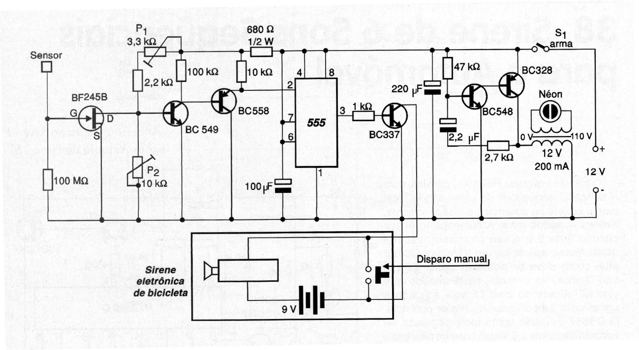 Este circuito de alarma de aproximación capacitiva se encontró en una documentación de 2002. El cable al elemento sensor, una plancha colocada en el panel de la motocicleta, debe ser corto y blindado si es posible. El circuito tiene un indicador de funcionamiento de neón, que en una versión moderna puede ser reemplazado por un LED intermitente.