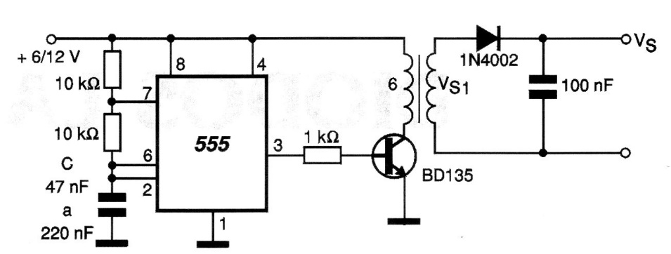 Este circuito genera una alta tensión continua de 6 a 12 V de tensión de entrada. El circuito se basa en un 555 y un transistor de potencia que debe montarse en un disipador de calor. El transformador puede ser del tipo con primario de 110 V y secundario de 6 a 12 V con corriente de 200 a 500 mA.