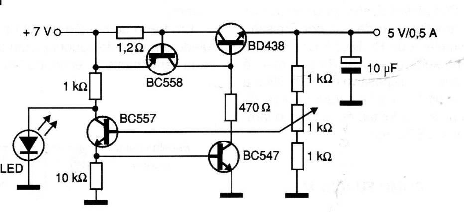 Este circuito regulador de tensión usa solo transistores y puede proporcionar una corriente de salida máxima de 500 mA. El transistor de potencia debe montarse en un disipador de calor y el ajuste de tensión es en el trimpot de 1 k.