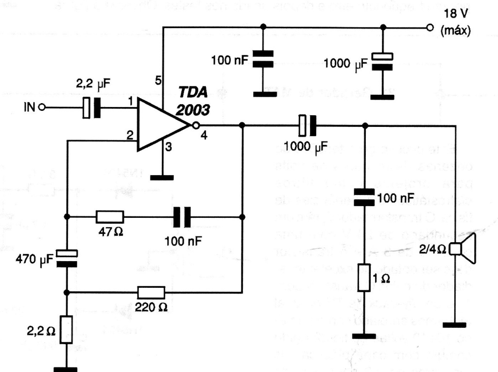 La potencia de 10 W se obtiene con una carga de 2 ohms. El circuito integrado debe montarse en un buen disipador de calor. La alimentación requiere una corriente de al menos 2 A. La ganancia del circuito es 100 veces dada por la relación entre los resistores de 220 ohms y 2,2 ohms.
