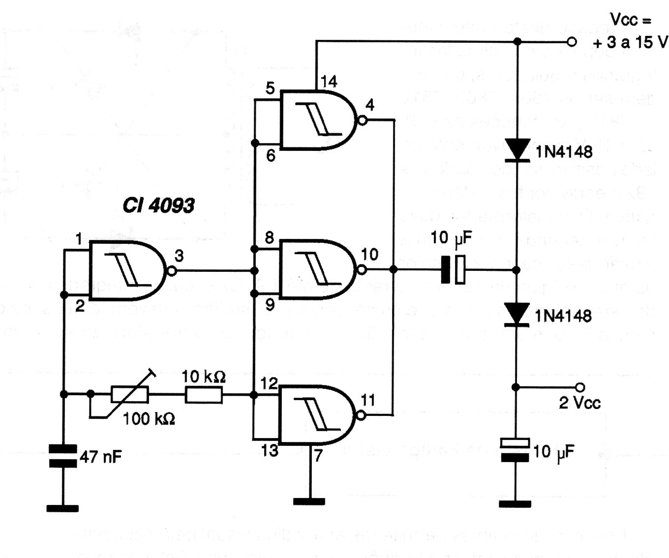 Este circuito, de una documentación de 2001, aparece en otra parte de este sitio. Su propósito es obtener una tensión continua que sea el doble de la tensión de entrada. La corriente es demasiado baja, lo que limita las aplicaciones del circuito a la polarización. El circuito opera con tensión de entrada de 3 a 15 V.