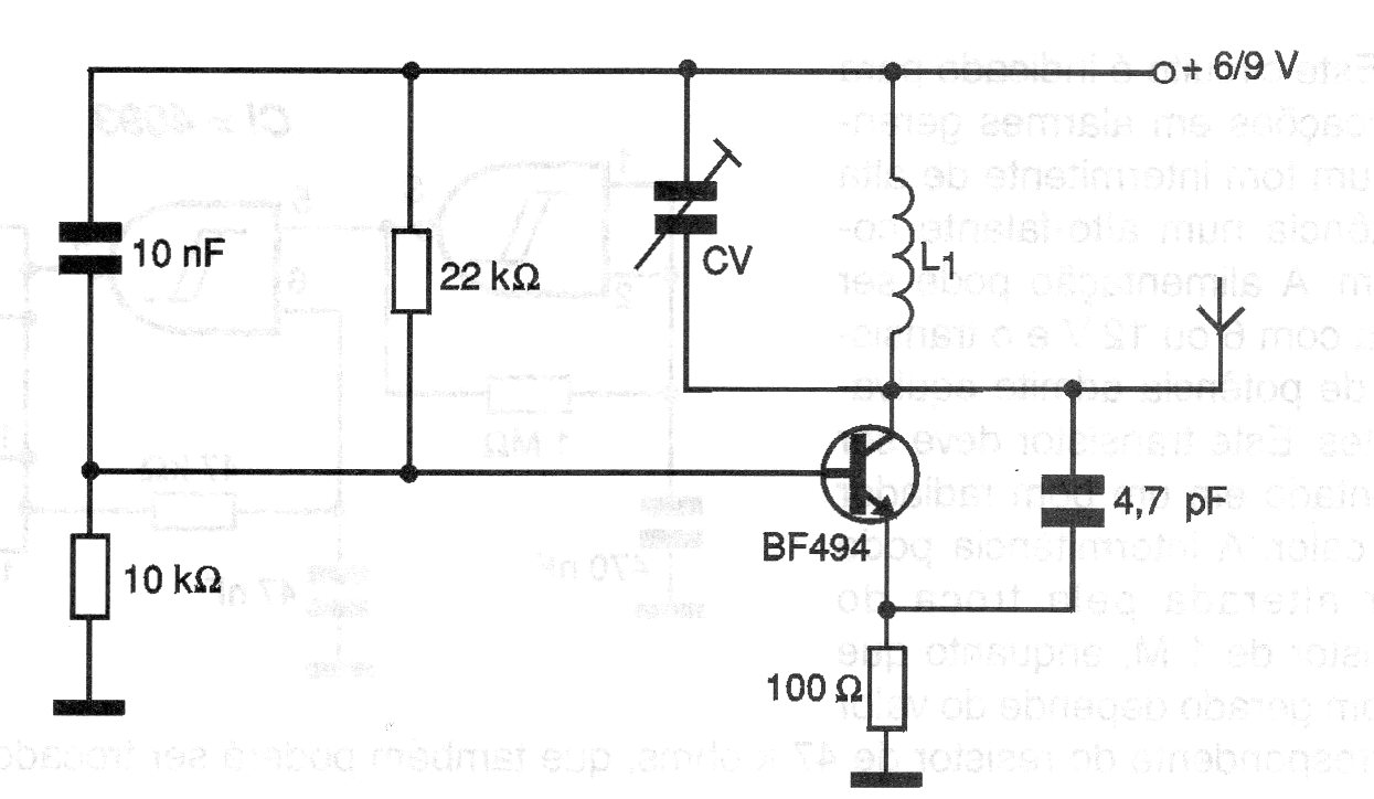 La bobina de este transmisor de señal de video compuesto analógico está formada por 6 o 7 salpicaduras de 26 o 28 hilos en forma de 1 cm sin núcleo. La señal de video se aplica al emisor del transistor a través de un capacitor de 100 nF. El alcance es de unas pocas decenas de metros.