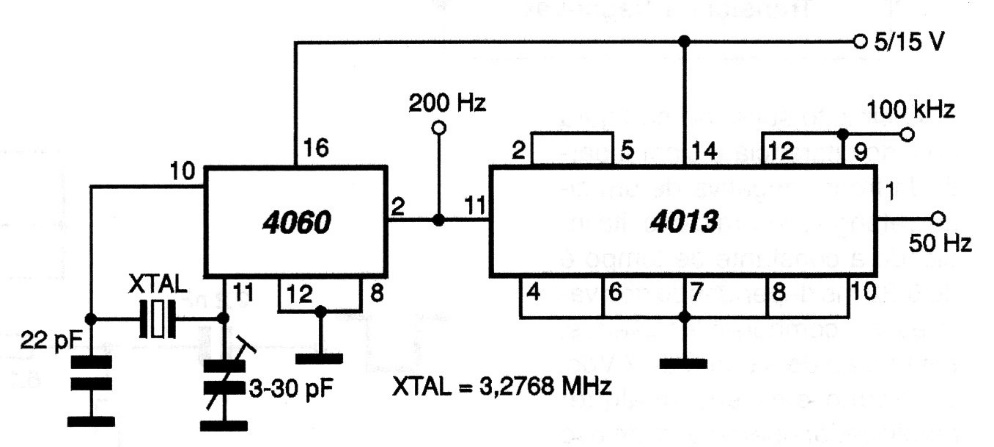 Este circuito genera señales de 50, 100 y 200 Hz a partir de un cristal de TV de 2,2768 MHz. El circuito se puede utilizar en instrumentos y relojes. Se pueden utilizar otros cristales para obtener 60, 120 y 240 Hz. El circuito se puede alimentar con tensiones de 5 a 15 V.