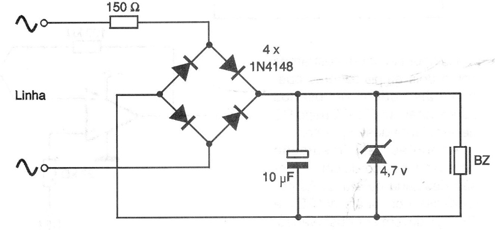 Este circuito permite la activación de un timbre telefónico remoto fabricado con una cápsula piezoeléctrica común. El circuito no necesita energía, ya que es alimentado por la propia señal de llamada de línea.