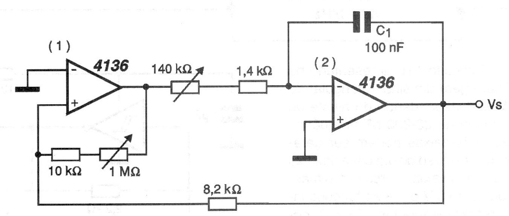 Este circuito utiliza un funcionamiento similar al 741 que se ha encontrado en una documentación de 2001. La fuente de alimentación debe ser simétrica y el circuito tiene una frecuencia determinada por C1. Para el valor indicado, la frecuencia es de 1 kHz.
