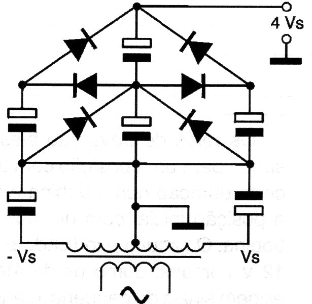 Esta interesante configuración, que lleva el nombre de sus desarrolladores, multiplica por 4 la tensión secundaria de un transformador y puede utilizarse en fuentes de alta tensión y también en circuitos de válvulas. Los diodos y capacitores dependen de la tensión y corriente de la fuente.