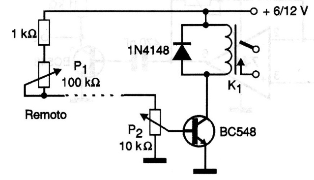 El relé de este circuito se cierra cuando el potenciómetro sensor P1 alcanza la posición configurada en P2. El circuito se puede utilizar para el control remoto de la posición, alimentado por 6 o 12 V, según la tensión del relé elegida.