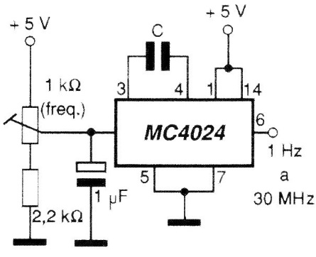 Este oscilador controlado por tensión utiliza un circuito integrado que no es común en la actualidad. Puede generar señales de 1 Hz a 30 MHz con una alimentación de 5 V. La frecuencia depende básicamente del valor del capacitor.
