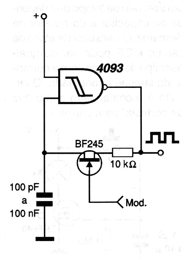 En la figura tenemos la forma de modular en frecuencia la señal rectangular generada por un oscilador con el 4093. El suministro se puede hacer con voltajes de 3 a 15 V y la frecuencia la determina el capacitor. En algunos casos, una resistencia de 1k a 100k debe conectarse en serie con la base del transistor.