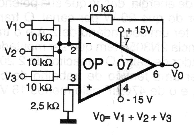 Los sumadores aparecen varias veces en este sitio con operadores de todo tipo. En este circuito, el voltaje de salida es la suma del voltaje de entrada, siempre que no exceda el voltaje de suministro. La fuente debe ser simétrica para que el circuito funcione con tensiones negativas y se puedan utilizar otros operacionales.
