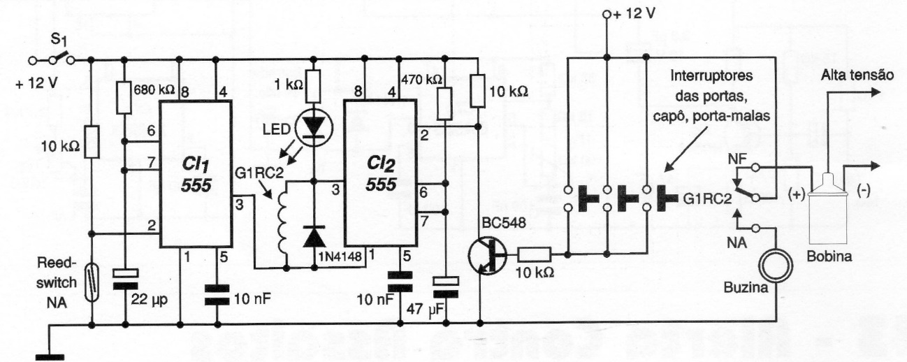 Este circuito es de la documentación de 2001, pero todavía se puede utilizar en algunos modelos de automóviles a los que se puede acceder fácilmente a la electrónica. El circuito evita que la corriente llegue a la bobina y así el vehículo funciona y, además, dispara la bocina.