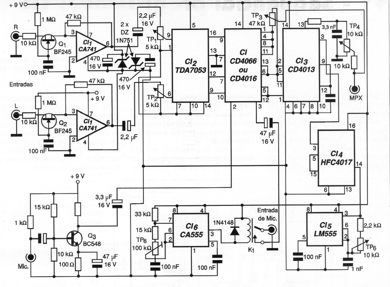 Este circuito es de la documentación de 2001 y sirve para multiplexar señales estéreo para transmisores de FM. El circuito debe ajustarse para obtener la frecuencia de la señal piloto y, además, para que exista una correcta excitación de los canales. La alimentación se suministra con una tensión estabilizada de 9 V. Las conexiones de señal deben ser cortas y blindadas.