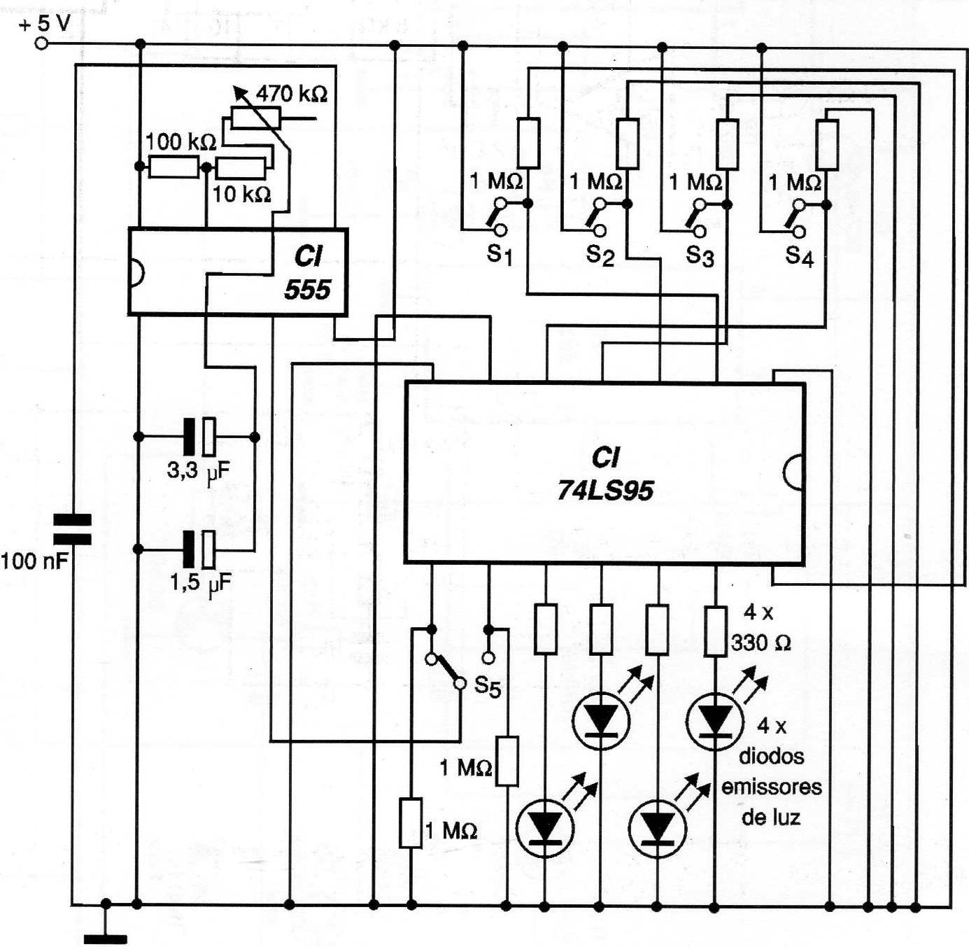 La secuencia de iluminación de los LED en este circuito, que se encuentra en una documentación de 2001, está determinada por la programación de los interruptores. La velocidad del efecto se ajusta en el potenciómetro y la alimentación debe realizarse con 5 V ya que es un circuito TTL. Los pasos de potencia en las salidas permiten impulsar cargas de potencia más altas.
