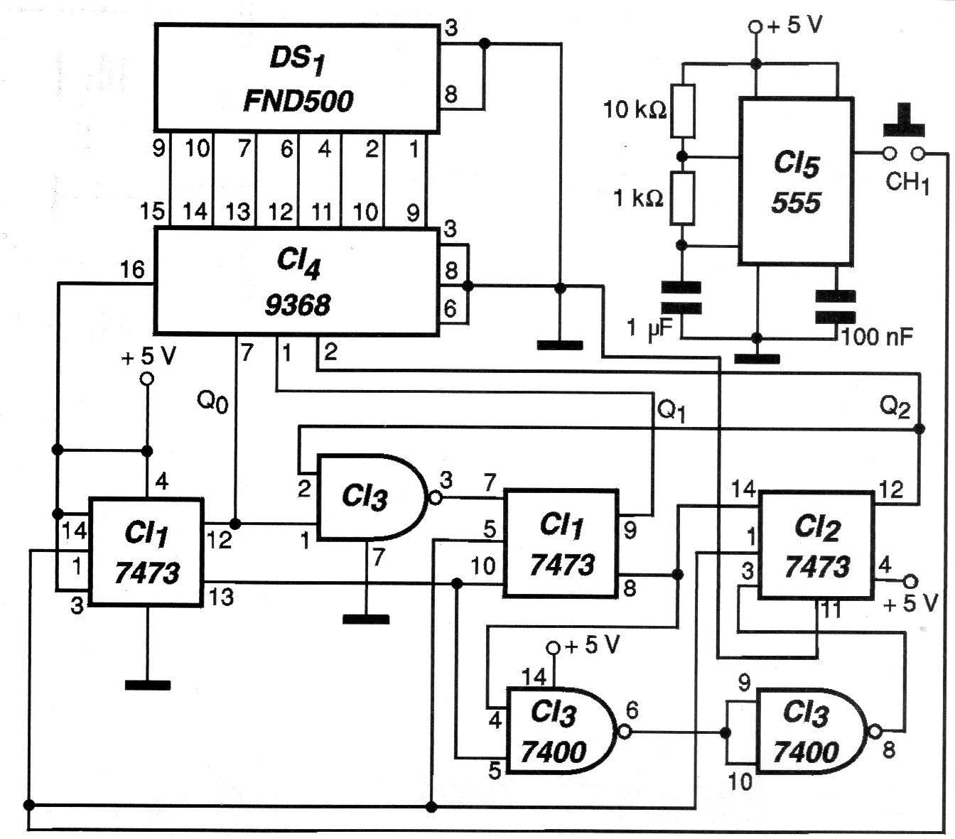 Este circuito utiliza una pantalla de cátodo común y circuitos integrados TTL. Lo encontramos en una publicación de 2001. El circuito debe estar alimentado por una fuente regulada de 5 V. La extracción se realiza presionando y soltando CH1.