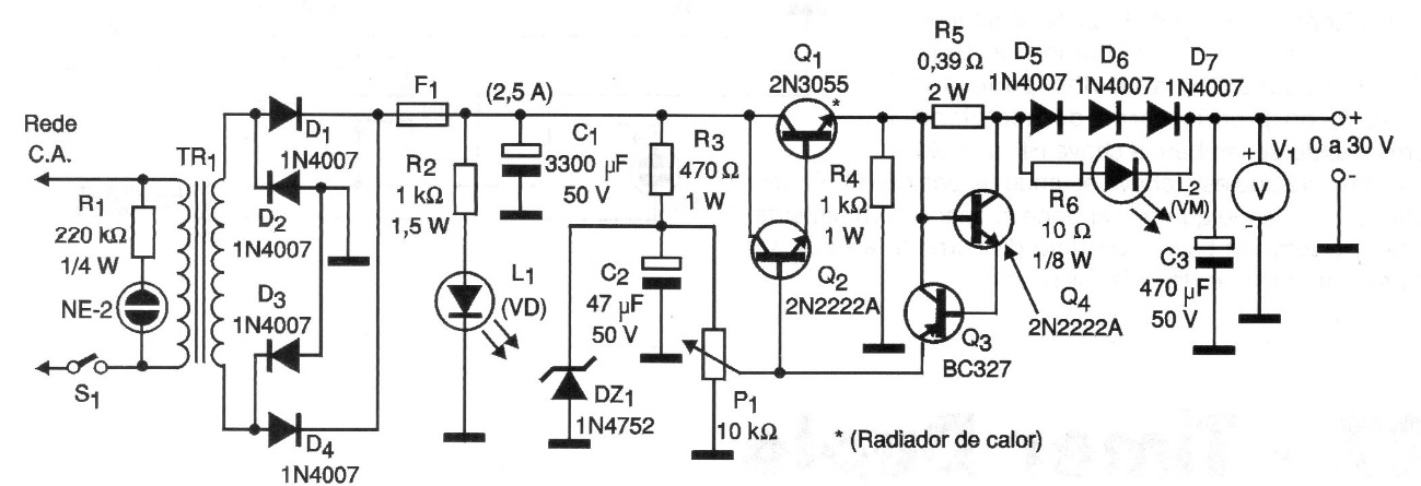 Esta fuente de transistores de sobremesa tiene protección contra cortocircuitos y solo utiliza transistores comunes. El 2N3055 debe tener un disipador de calor. La corriente máxima para el circuito de protección depende de R5. El voltímetro de salida es opcional y en su lugar se puede utilizar un multímetro estándar.