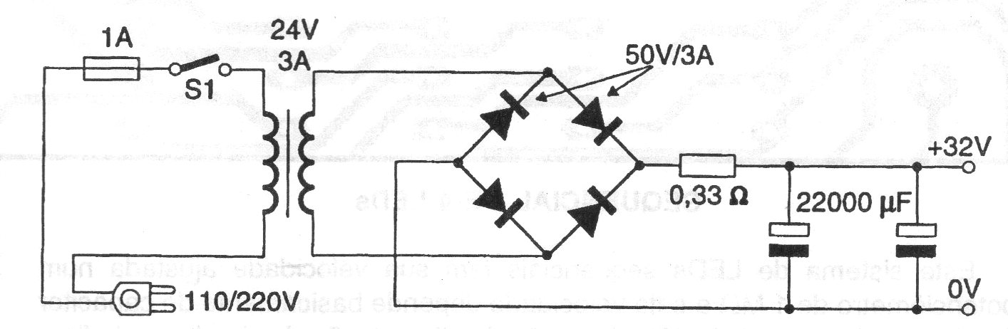 Esta fuente de alimentación no regulada se puede utilizar en una variedad de aplicaciones, como amplificadores de potencia. Los diodos son para 1 A o más y un voltaje inverso máximo de al menos 100 V. Los capacitores electrolíticos deben tener tensiones de trabajo de al menos 50 V.