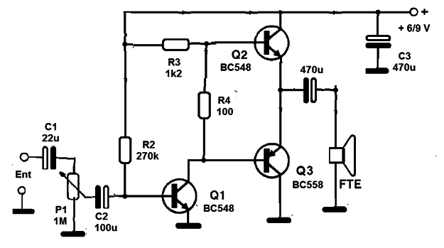 Este circuito es un amplificador de un Electronics Handbook de 1989. El proporciona unos pocos cientos de miliwatts de salida cuando se alimenta con una batería de 9 V. Los cambios al circuito original es recomendar los transistores que pueden ser el BC548 para Q1 y Q2 y BC558 para la Q3. El transformador se puede obtener de una radio transistor de radio fuera de uso. R1 es el control de volumen. El altavoz es pequeño de 8 ohmios. Si se utiliza la fuente de alimentación, debe tener una buena filtraje y proporcionar una corriente de al menos 100 mA. La entrada del circuito es de alta impedancia. El circuito puede ser utilizado en los receptores experimentales, intercomunicadores, sonido multimedia, etc.