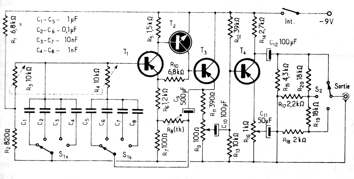 Encontramos este interesante generador de transistores en una documentación europea de la década de 1980. El circuito se puede ensamblar con transistores modernos y la precisión depende de los componentes utilizados. Los NPN pueden ser BC548 y PNP pueden ser BC558.