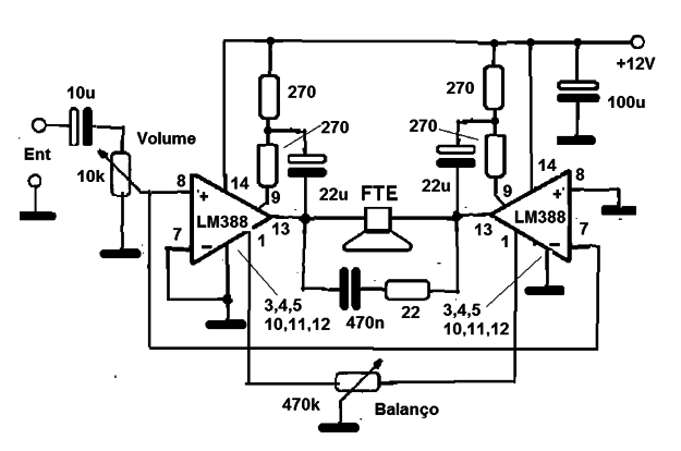 Este circuito se encuentra en una publicación de 1994, pero obtuvo originalmente del propio manual de National Semiconductor. National es ahora una compañía del grupo de Texas Instruments. El circuito utiliza dos LM388 en puente, que proporciona una salida 4 W. Su alimentación puede hacerse por simple suministro de 12 V con al menos 1 A. Se utiliza carga de 8 ohmios como altavoz. Los pinos 3, 4, 5, 10, 11 y 12 deben estar conectados a un área más grande de la placa de cobre para servir como un disipador de calor.
