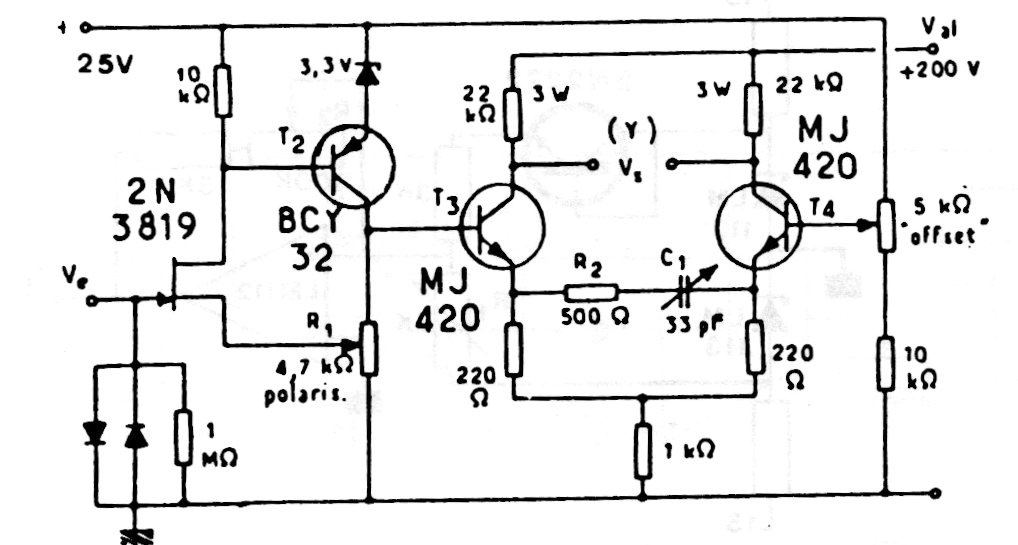 Este circuito fue encontrado en una documentación de los años 90, siendo indicado para la deflexión de tubos de rayos catódicos. Consiste en un amplificador de tensión de CC y opera a frecuencias de hasta 1 kHz. Los transistores utilizados son poco comunes en la actualidad.