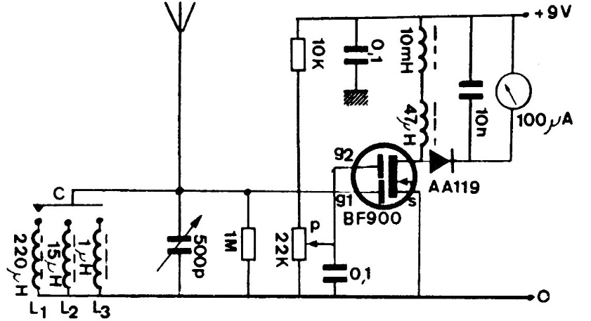 Este circuito cubre de 400 kHz a 40 MHz en tres bandas según la bobina seleccionada. El doble MOSFET permite equivalentes, ya que el original no es fácil de obtener.
