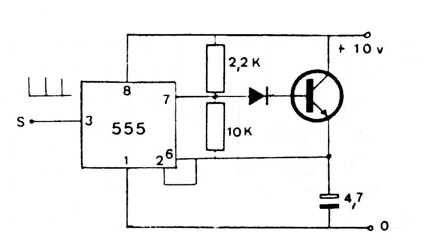 Este circuito genera pulsos de corta duración mediante un circuito integrado 555. Los pulsos son de 120 ms con una separación de 10 segundos, para los valores de los componentes utilizados. Se pueden realizar cambios en los valores de los componentes y el transistor es un BC548.