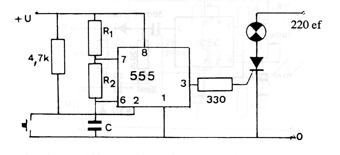 En la figura tenemos la forma de controlar la acción de un SCR usando un 555. El tiempo de oscilación del astable 555 depende de R1, R2 y C. En el sitio web hay varios artículos que enseñan cómo calcular estos componentes.