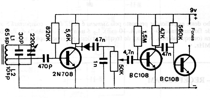 El primer transistor puede ser el BF494 y el otro BC548 en esta radio AM que se encuentra en una documentación de los años 90. El circuito debe usar auriculares de alta impedancia y es alimentado por una batería de 9 V. Para estaciones más fuertes, no es necesario usar una antena externa.