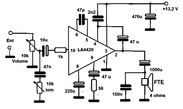 El circuito presentado utiliza un circuito integrado Sanyo, no es muy común en nuestros días. Este amplificador proporciona una potencia de 5,5 W en 4 Ω de carga que se encuentra en muchas radios de coche y casetes más antiguos. Se puede utilizar en un buen sistema de sonido, intercomunicadores y como amplificador multimedia, la fuente debe proporcionar al menos 2,5 A por canal. El circuito integrado debe estar provisto de radiador de calor.