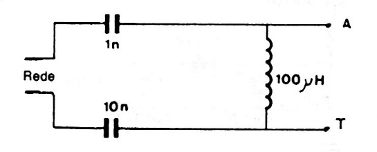 Los cables de red funcionan como antenas. Las podemos aprovechar con este circuito que consta de un filtro que bloquea la alimentación y deja pasar las señales a un receptor. Los capacitores deben estar hechos de poliéster metalizado con una tensión de trabajo de al menos 600 V.
