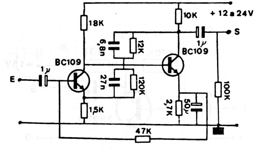 Este preamplificador de ecualizador RIAA se encontró en un esquema de la década de 1990. Los transistores son una versión antigua del BC549 que se puede usar como reemplazo. Los cables de entrada y salida de señal deben estar blindados.