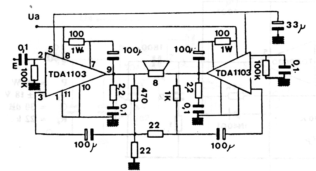 Este es un circuito comercial de Philips de la década de 1980. El circuito debe estar alimentado por 28 V y su ganancia es de 40 dB. La resistencia de entrada es de 100 k ohmios. El circuito integrado debe tener un buen disipador de calor.