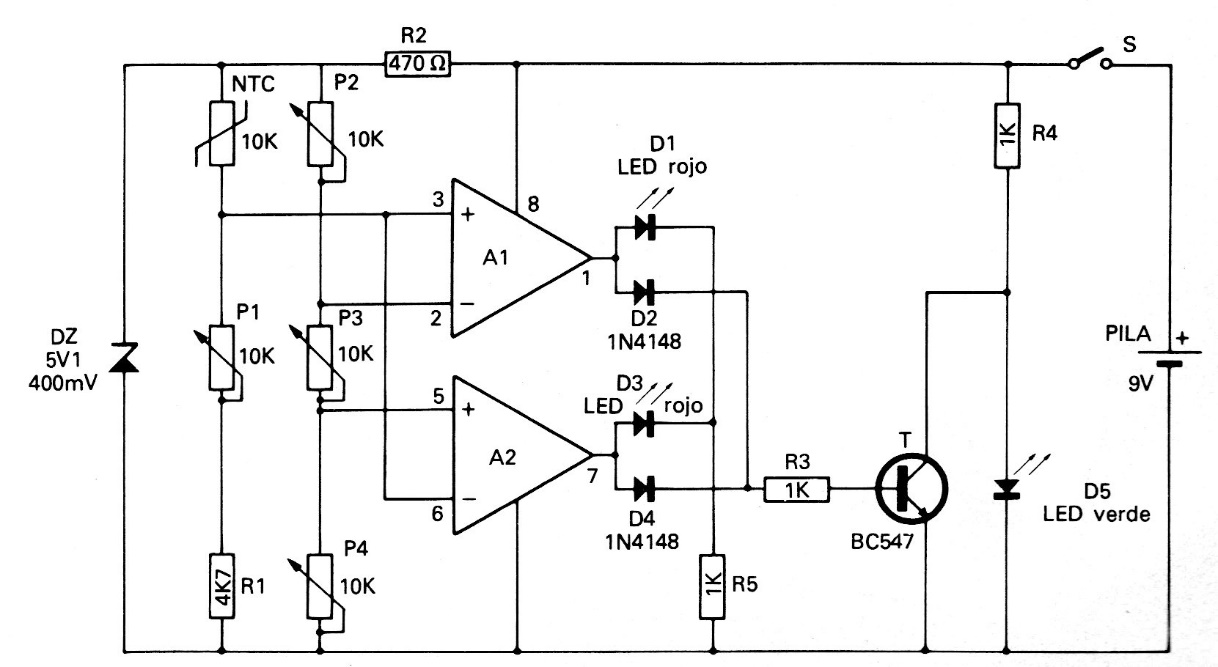 Este circuito enciende un LED cuando la temperatura supera un cierto valor preestablecido y enciende el otro cuando la temperatura cae por debajo de un segundo valor establecido. El comparador puede ser el LM339 y el sensor es un NTC de 10 k ohms.