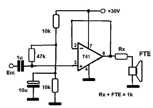 Adaptamos este circuito que se encuentra en la Radio Electrónica de marzo de 1990. La revista ya no existe, pero el circuito se puede montar fácilmente. En lugar de Rx y un altavoz de baja impedancia se puede utilizar con un pequeño transformador de radio transistorizado. La fuente de alimentación no necesita ser simétrica y es de 6 a 30 V. Esto es una versión mejorada del circuito anterior, con un mejor rendimiento y estabilidad. La ventaja de este circuito es el uso de una sola fuente de alimentación. La impedancia de entrada es alta y la fuente debe tener una excelente filtraje.