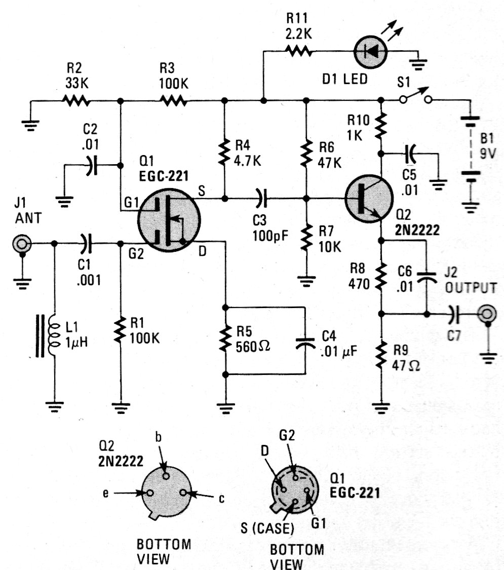 Este circuito está intercalado entre la antena externa y el receptor de onda corta, proporcionando mucha mayor sensibilidad a su receptor. La alta ganancia de este circuito permitirá escuchar las estaciones más débiles en la banda de 3 a 30 MHz. El circuito es de una vieja revista estadounidense y el FET utilizado puede presentar alguna dificultad para obtenerlo.