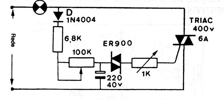 Este circuito solo funciona con lámparas incandescentes y la frecuencia se ajusta en el potenciómetro, dependiendo también del capacitorr. El triac debe estar equipado con un disipador de calor. El circuito es de un manual de los 80.