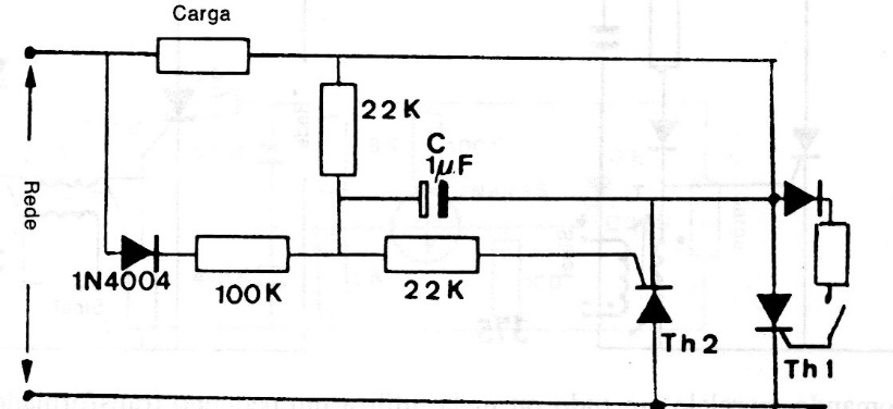 En este circuito tenemos la forma de usar un interruptor simple para controlar los SCR en un sistema de onda completa. El circuito es de un manual de los 90 y se deben especificar SCR para controlar la carga elegida. Los SCR deben estar provistos de disipadores de calor, según la carga controlada. La resistencia sin valor tiene 330 ohms a 1 k, dependiendo de la sensibilidad de los SCR.