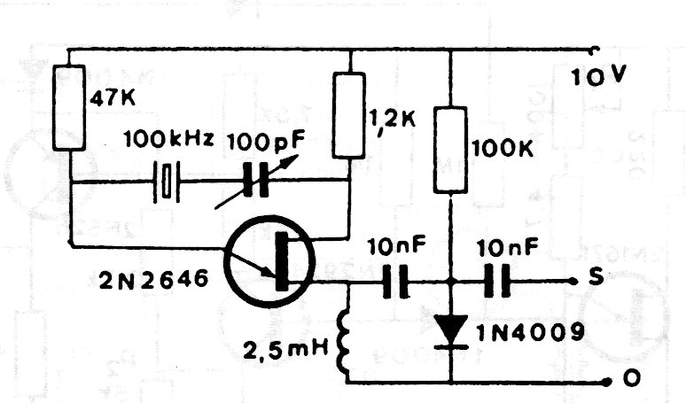 Este oscilador usa un cristal para ajustar la frecuencia. El límite de funcionamiento de la unión única es del orden de 100 kHz. El circuito se encontró en un manual de los 90.