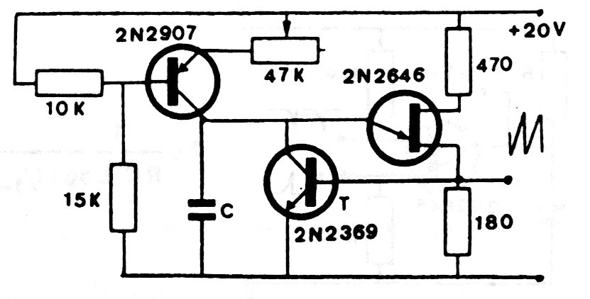Con este circuito es posible acelerar la descarga de un condensador en un oscilador unijuntura, reduciendo así los pulsos de salida. El circuito es de un manual antiguo de circuito y C determina la frecuencia de operación.
