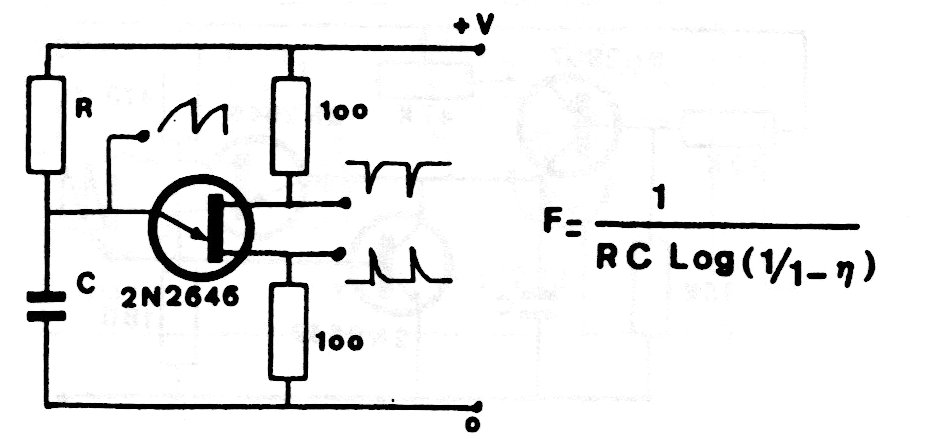 En la figura, la conocida configuración básica de oscilador de relajación con transistor unijuntura. La fórmula para calcular los componentes se da junto al diagrama. Este circuito aparece varias veces en este sitio, donde también tenemos muchas aplicaciones prácticas.