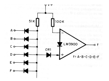 El diagrama muestra una puerta Y (AND) implementada con un operacional de transconductancia LM3900. El circuito es de un manual de amplificadores operacionales de los años 90. La tensión de alimentación debe hacerse de acuerdo con la lógica en la que se aplicará la puerta.