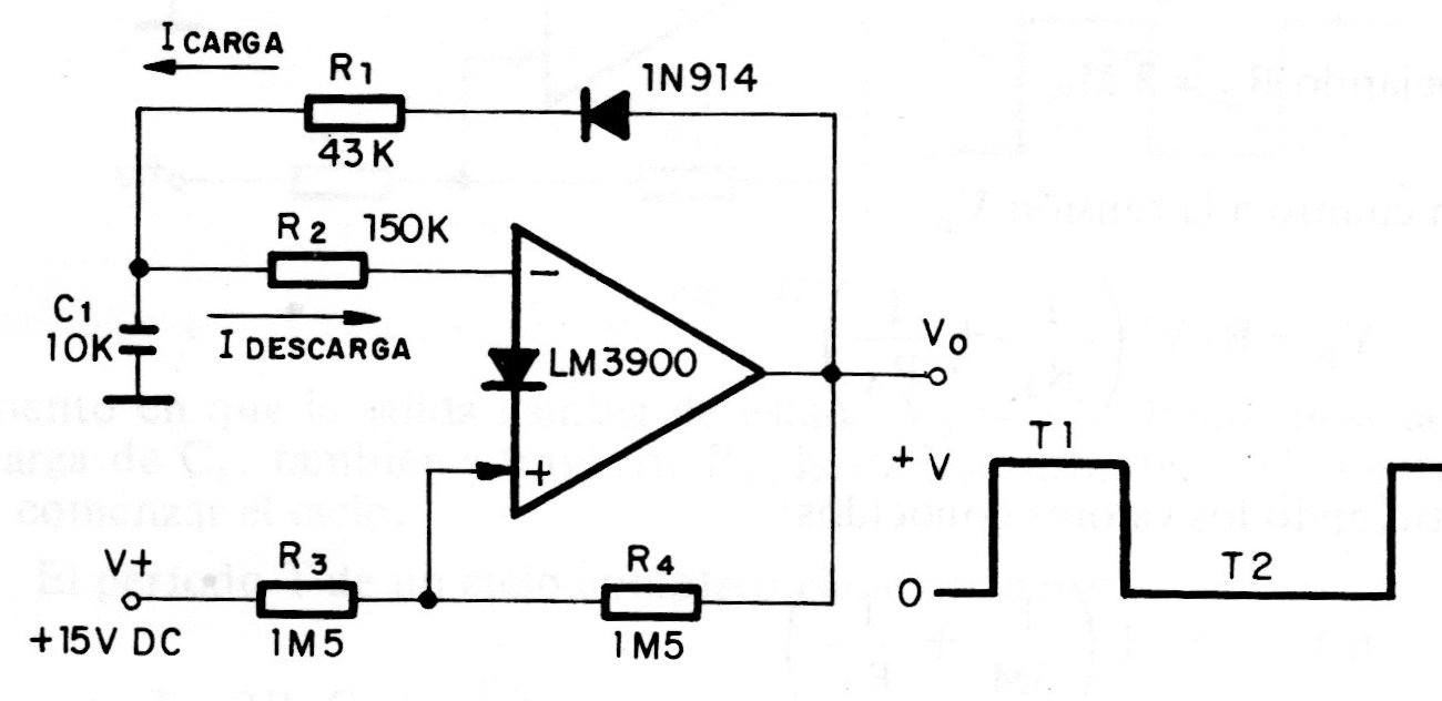 Este circuito utiliza un amplificador operacional de transconductancia LM3900 para generar pulsos cuya duración depende de R1 y la separación de R2. La frecuencia depende de C1. Todos estos componentes se pueden cambiar según la aplicación.