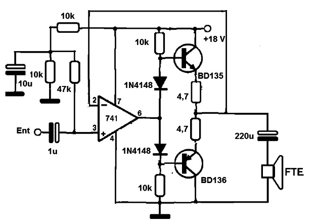 La versión original de este circuito fue sugerido por una Radioelectrónica de 1990. El circuito se puede montar con el par BD135 BD136. Tenga en cuenta el altavoz es de alta impedancia. Con el par de BD puede tener una impedancia inferior para los altavoces y mayor potencia de salida. La ventaja de este circuito en comparación con el anterior es que no necesita de alimentación dual. Los transistores de salida deben utilizar un radiador. La impedancia de entrada es alta. El cable de señal de entrada debe ser blindado.