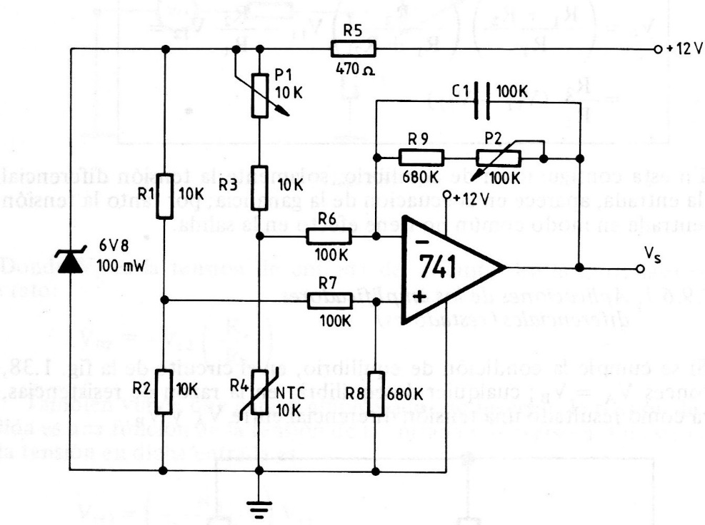 Este circuito que tiene una excelente linealidad utilizando un NTC como sensor fue encontrado en una publicación europea de los años 90. El circuito no necesita alimentación simétrica y se pueden utilizar amplificadores operacionales equivalentes. P2 ajusta la ganancia y P1 la escala del convertidor.