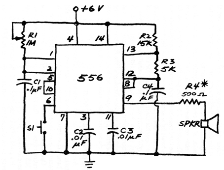 De hecho, el 556 consta de un doble 555, que puede ser sustituido por estos integrados. El circuito es de documentación estadounidense y la carga de salida puede tener una resistencia menor, hasta 120 ohms, para un volumen mayor. El circuito funciona con tensiones de 5 a 12 V.