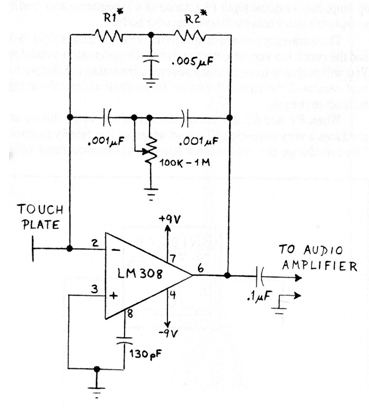 Los osciladores amortiguados se pueden utilizar para producir sonido de instrumentos de percusión como el triángulo, la campana, el tambor, etc. El circuito que se muestra también puede tener el 741 en lugar del amplificador original y R1 y R2 determinan el sonido. Sus valores oscilan entre 33k y 1 M, para los sonidos del más alto al más bajo. La fuente debe ser simétrica de 6 a 9 V. El circuito es de documentación de 1991.