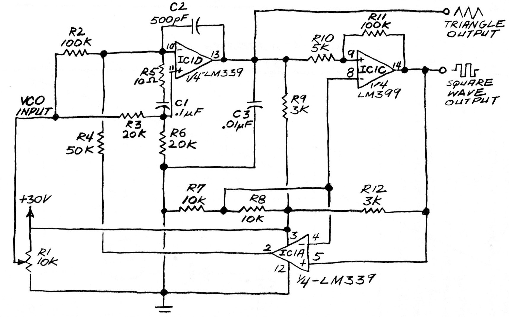 Este circuito se basa en los comparadores de tensión contenidos en el circuito integrado LM339. El circuito es de una documentación de 1991 y debe ser alimentado por una fuente simple de 30 V. Con los componentes utilizados, la frecuencia varía entre aproximadamente 5 y 50 kHz.